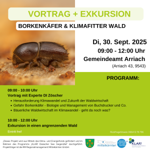 Die Klimawandel-Anpassungsregion (KLAR!) Ossiacher See Gegendtal und die Gemeinde Arriach veranstalten am 30. September 2025 einen Vortrag mit Exkursion zum Thema Borkenkäfer und klimafitter Wald.