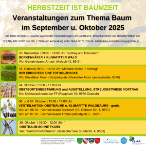 Die Klimawandel-Anpassungsregion (KLAR!) Ossiacher See Gegendtal lädt im Herbst 2025 zu einer vielfältigen Reihe an kostenlosen Veranstaltungen ein. Unter dem Motto „Herbstzeit ist Baumzeit“ dreht sich alles um klimafitte Wälder, Obstsortenvielfalt und die Pflege unserer Bäume.