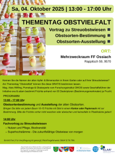 Die KLAR! Ossiacher See Gegendtal lädt am Samstag, 4. Oktober 2025, von 13:00 bis 17:00 Uhr zu einem besonderen Thementag rund um die Vielfalt unserer Obstsorten ein. Veranstaltungsort ist der Mehrzweckraum der FF Ossiach (Rappitsch 59, 9570)