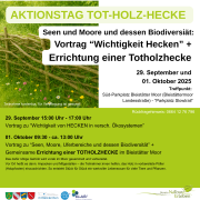 Der Aktionstag startet um 09:30 Uhr mit einen Kurzvortrag über die Bedeutung von Seen, Mooren und Uferbereichen für die Artenvielfalt. Gleich danach erfahren die Teilnehmer:inne unter fachkundiger Anleitung wie eine Totholzhecke aufgebaut wird und warum solche Strukturen für die Biodiversität so wichtig sind. Anschließend wird gemeinsam angepackt: Stück für Stück entsteht ein neuer, artenreicher Lebensraum mitten im Naturschutzgebiet. Besucher:innen erhalten spannende Einblicke in ökologische Zusammenhänge und die Rolle naturnaher Landschaftselemente im Klimawandel.
