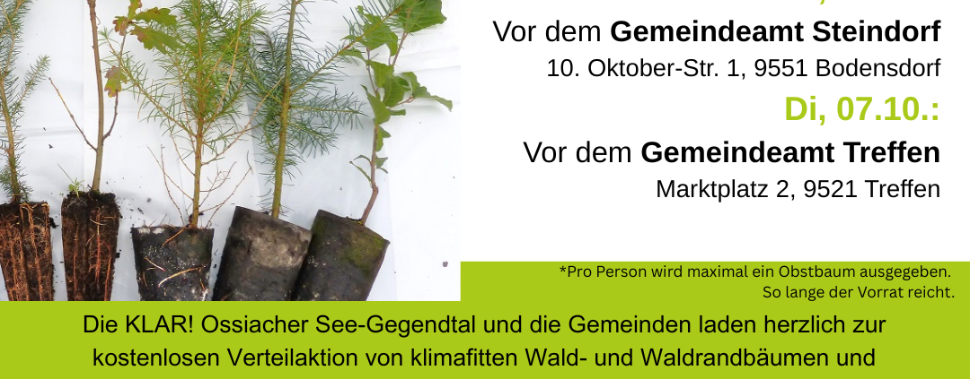 Die KLAR! Ossiacher See Gegendtal und die beteiligten Gemeinden laden herzlich zu einer kostenlosen Verteilaktion von klimafitten Waldbäumen und hochstämmigen Obstbäumen ein.